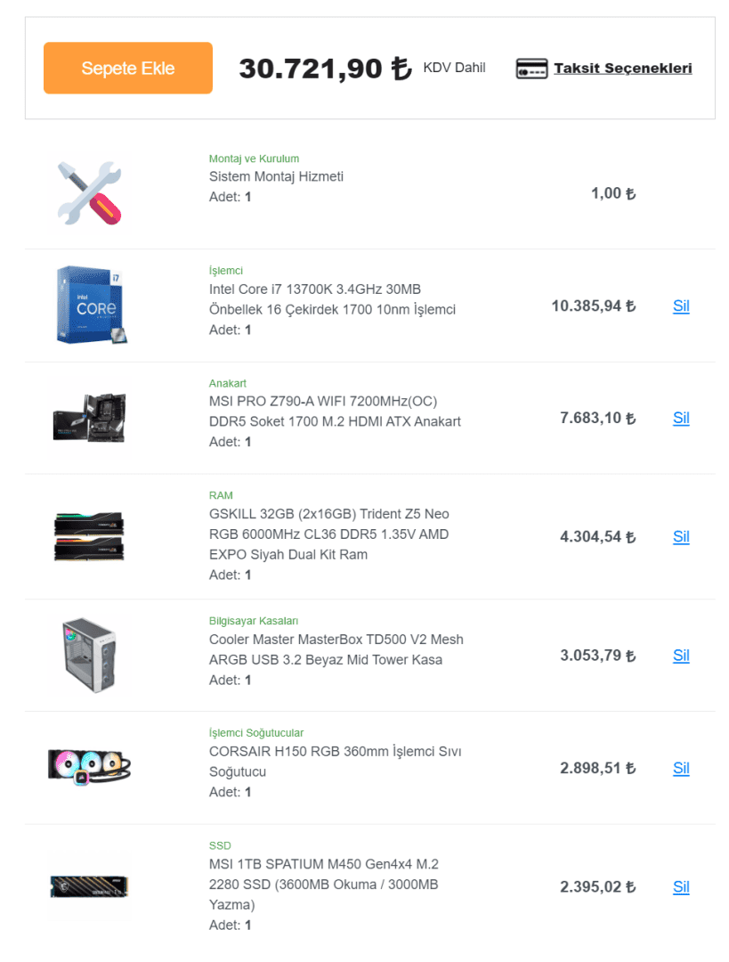 Sana bir görsel ve ekstra link atacağım. Bu donanımları diğer daha ucuza satan yerlerden parça parça almaya bak.