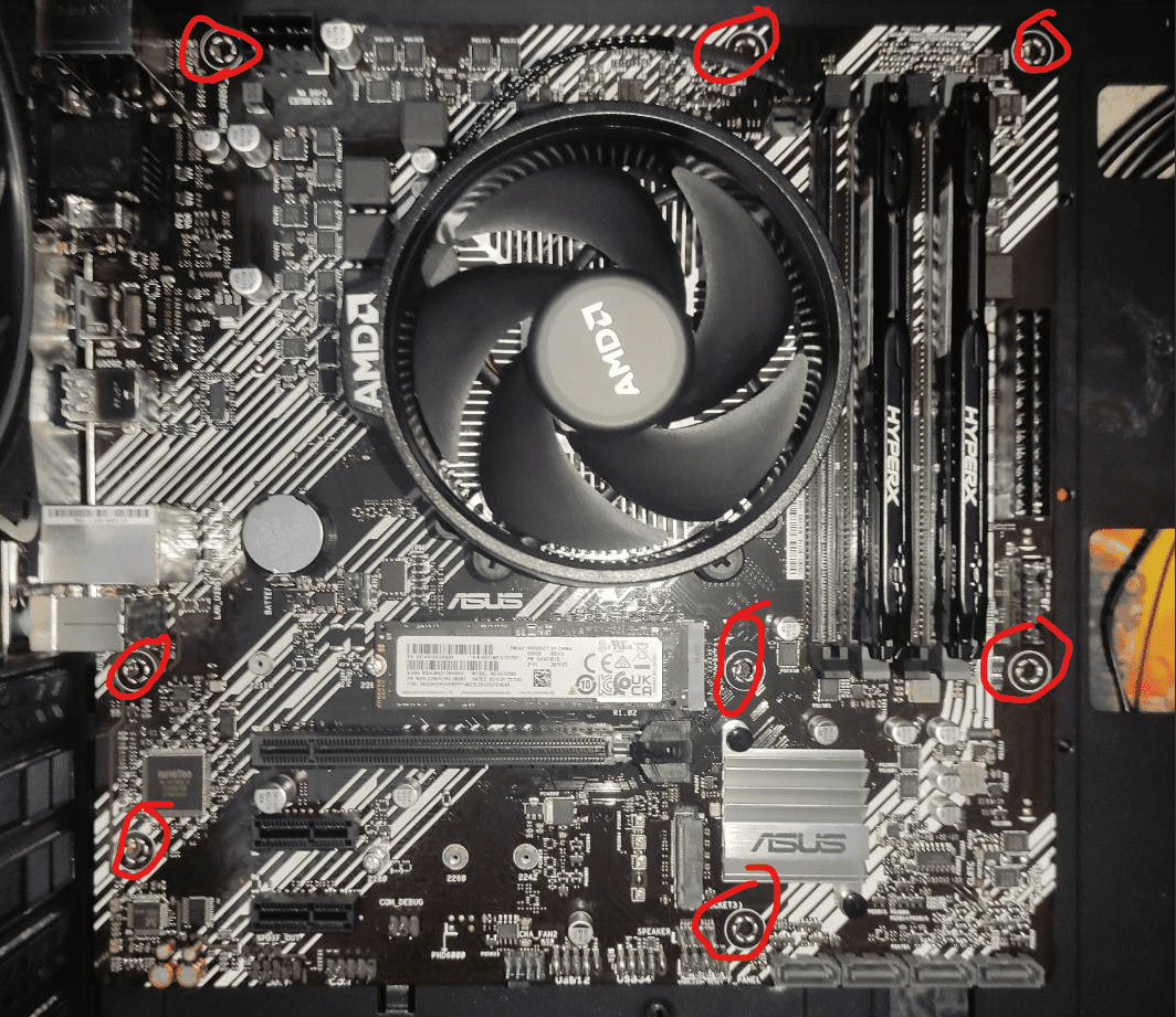 8 vida takmanız gerekiyor, şuralara takmadınız mı?6 vida taktim simdi cpu guc kablosu ile 24 pini takiyorum degilmi
