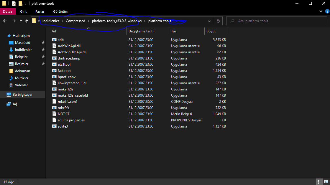 zipten çıakrdığın klasörü aç ve karaladığım yerdeki yazıyı sil ve oraya "cmd" yaz ve entere bas cmd ekranı gelecektir.